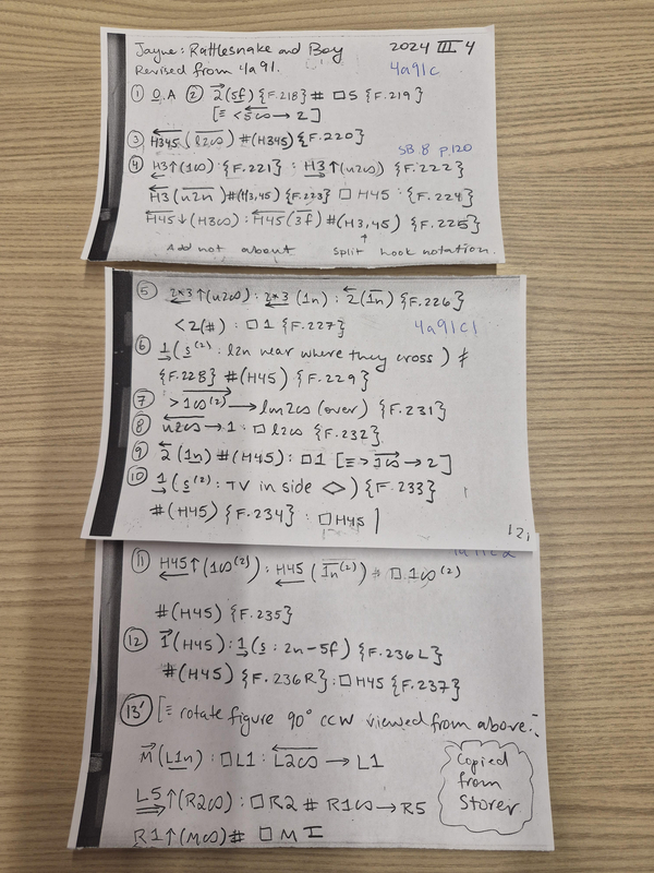 Norman Levine asked the string figure mailing list for a quick demonstration of Jayne’s figure Rattlesnake and Boy. I found my old notes about the figure from March 2024 and filmed them.
